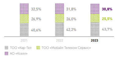 В конце 2023 года абонентская база АО «Кселл» насчитывала 7,8 млн абонентов, или 30,8% от  общего количества казахстанских абонентов сотовой связи.