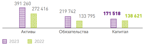 Балансовая стоимость активов Компании выросла в 2023 году на 43,6% и составила 391,3 млрд тенге. Рост показателя был обусловлен преимущественно стоимости основных средств и нематериальных активов.