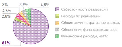 В структуре расходов Компании наибольший удельный вес занимает себестоимость реализации, на которую приходится 81% от совокупных расходов. Значимыми статьями являются также общие и административные расходы (4,6%) и расходы по выплате КПН (4,8%). На другие виды расходов приходится в общей сложности примерно 9,6% совокупных расходов.