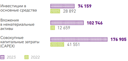 Размер капитальных вложений увеличился по сравнению с 2022 годом в  4,3 раза и  превысил 176,9 млрд тенге. При этом вложения в нематериальные активы выросли в 8,1 раза (с 12,7 до  102,7 млрд тенге), вложения в  основные средства – в 2,6 раза (с 29,0 до 74,1 млрд тенге).
