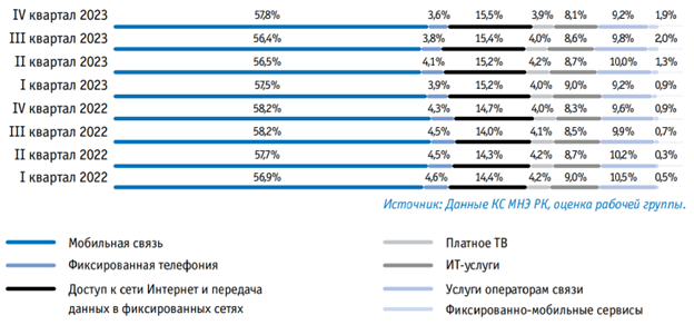 На основании годового отчета АО “Казахтелеком” по итогам 2023 года общий объем рынка услуг связи превысил показатель предыдущего года на 14%. Выручка от мобильной связи составляет 57,8% от всего рынка услуг связи.